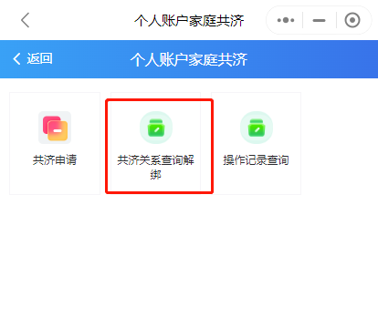 第四步:辦理完成后,可通過“家庭共濟”——“共濟關(guān)系查詢解綁”查詢綁定情況,“解除綁定”功能也可在此界面操作。