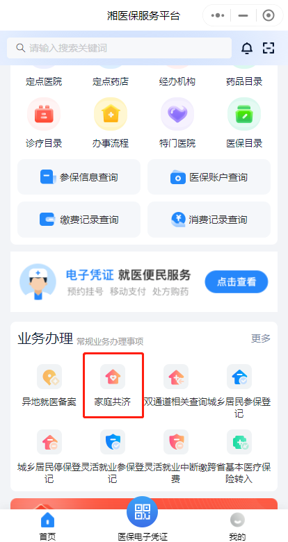 第一步:下載“湘醫(yī)?!盇pp,或進入“湘醫(yī)?!盇pp小程序,登錄后在首頁“業(yè)務(wù)辦理”中找到“家庭共濟”,點擊“共濟申請”。